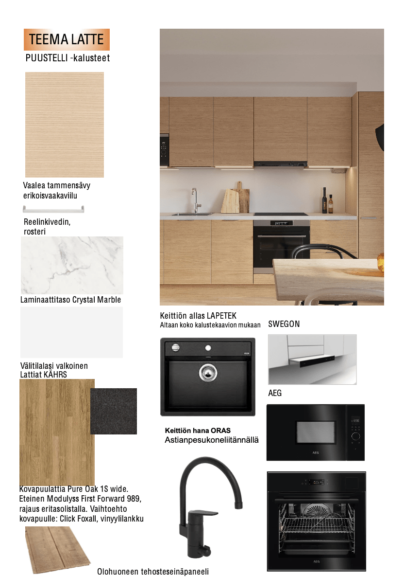 | Keittiön varustus | Jääkaappi ja pakastin: jääkaappi/pakastin Muut varusteet: mikroaaltouuni, astianpesukone, kiinteät valaisimet, liesituuletin / hormi Tasot: laminaatti Seinät: maalattu Lattia: muu, vinyyli Liesi/uuni: integroitu, induktio, erillisuuni |