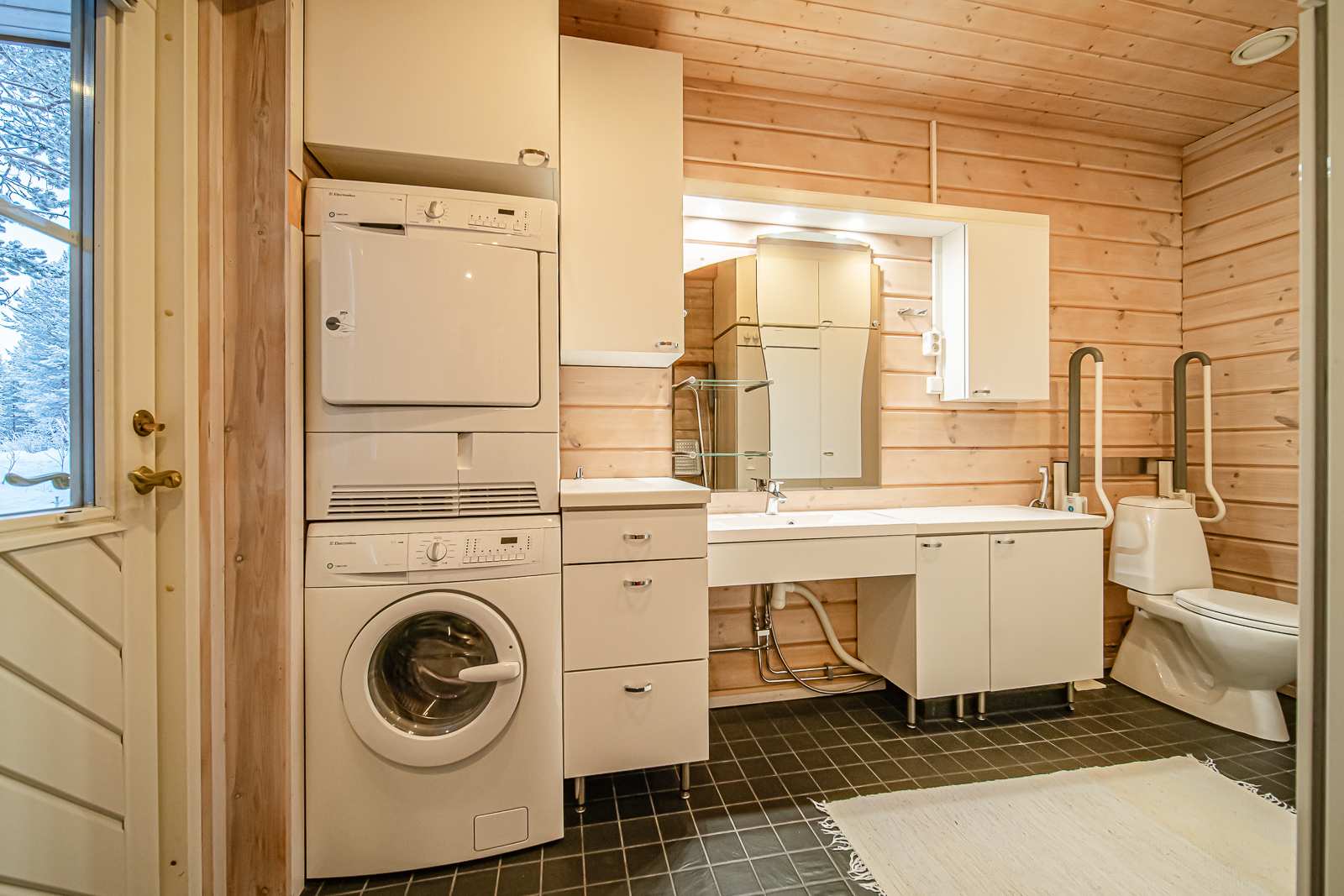 | Kodinhoitohuone | Seinät: puu Varusteet: pesukone, kuivausrumpu, kuivauskaappi, pesuallas, pöytätaso Lattia: laatta |