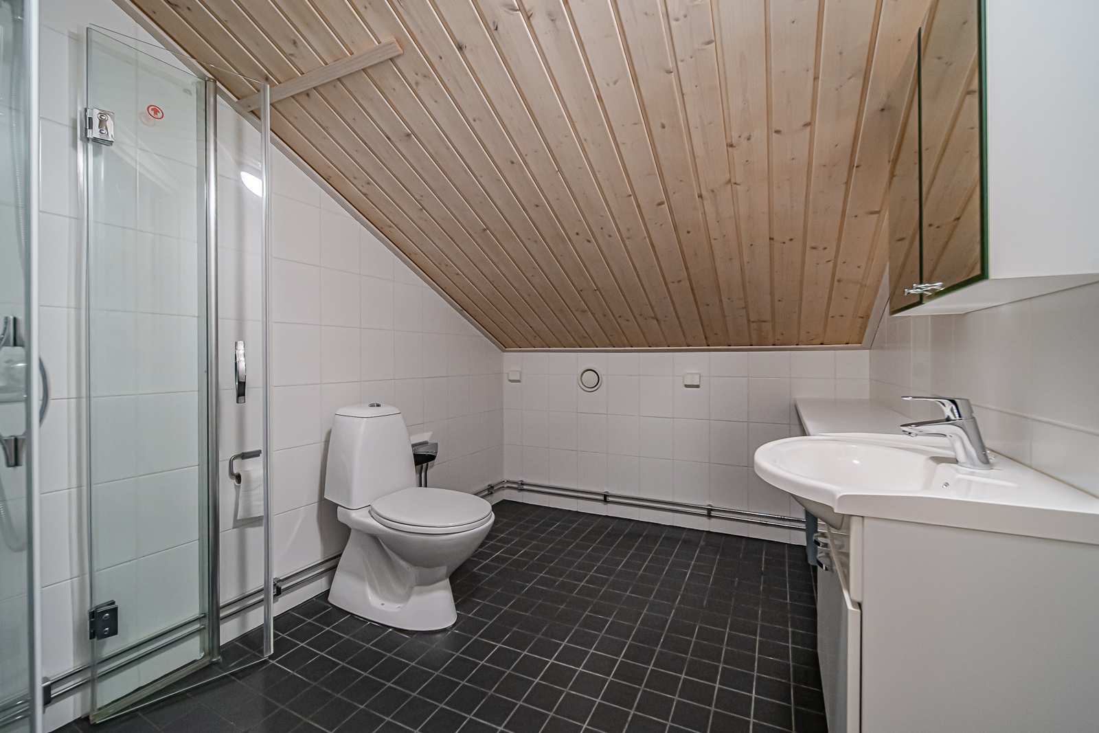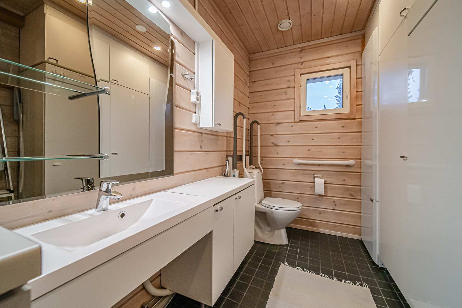 | Erillinen WC | Kodinhoitohuoneen wc:ssä tilaa liikuntarajoitteisellekin. Lattia: laatta Seinät: puu Lukumäärä: 3 |