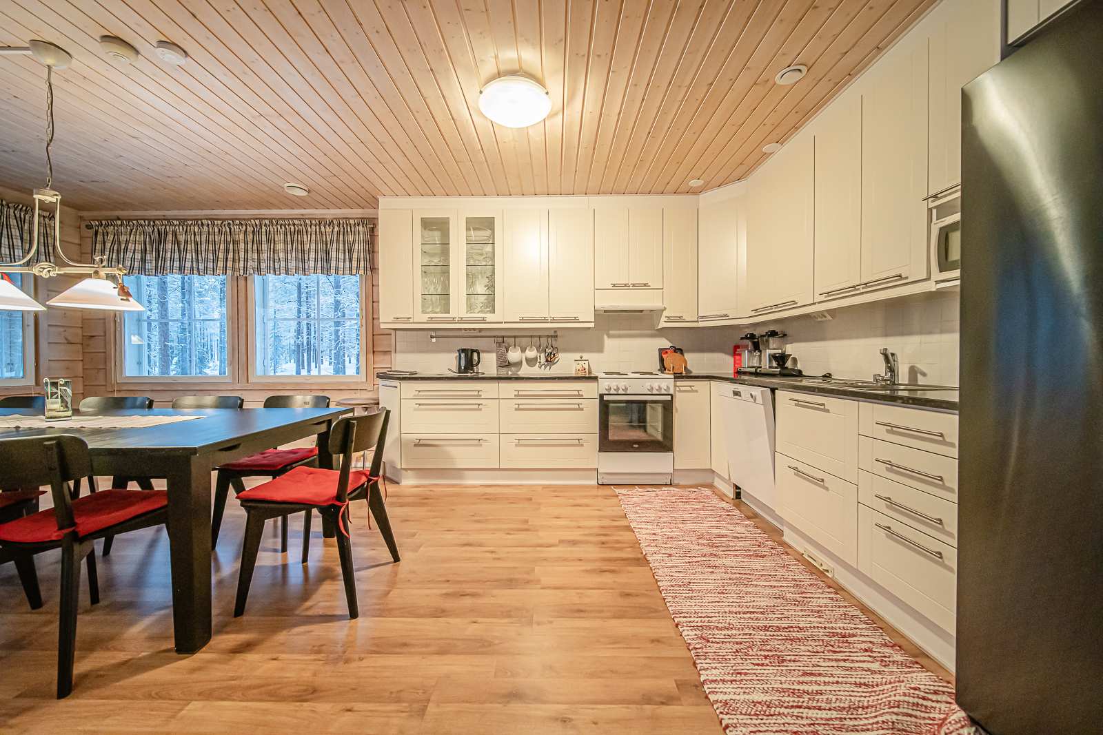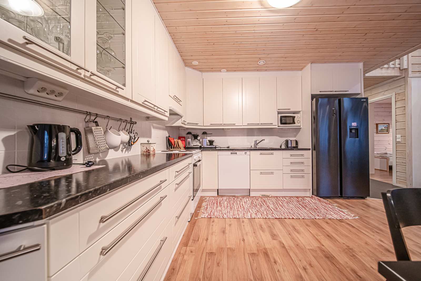 | Keittiön varustus | Jääkaappi ja pakastin: jääkaappi/pakastin Tasot: laminaatti Seinät: kaakeli, puu Lattia: laminaatti Muut varusteet: liesituuletin, mikroaaltouuni, astianpesukone Liesi/uuni: muu |