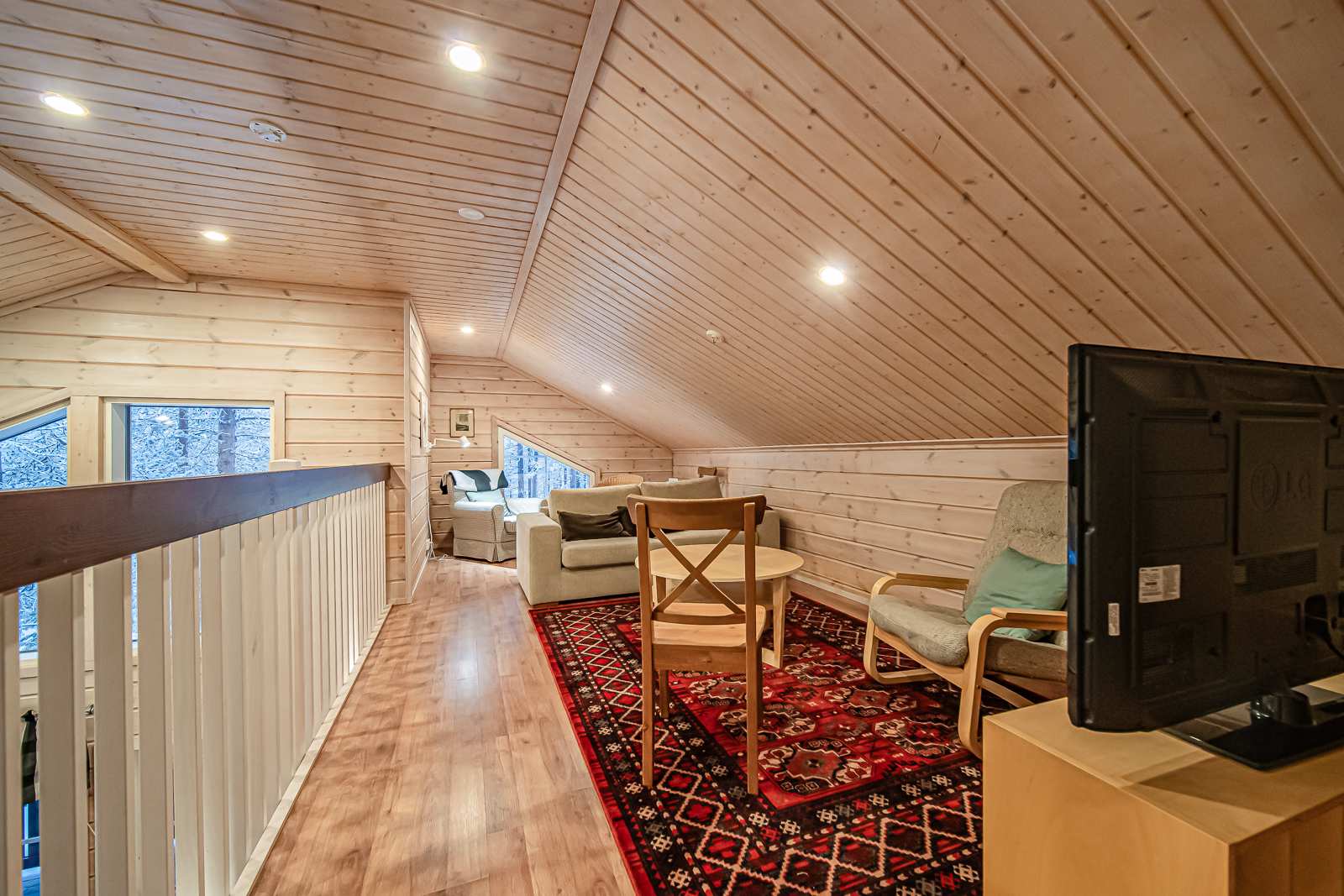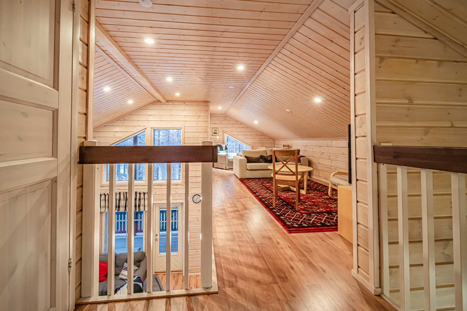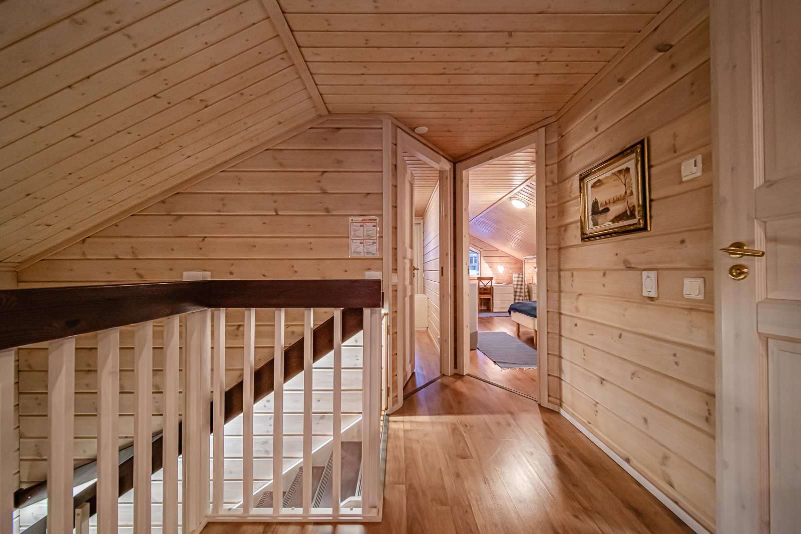 Ensimmäisessä kerroksessa tilava tupakeittiö, kaksi makuuhuonetta, toisessa vaatehuone, kodinhoitohuone wc:llä, erillinen wc sekä pukuhuone-kylpyhuone-sauna -osasto. Toisessa kerroksessa kaksi makuuhuonetta, molemmista käynti parvekkeelle, oleskelutila sekä kylpyhuone.