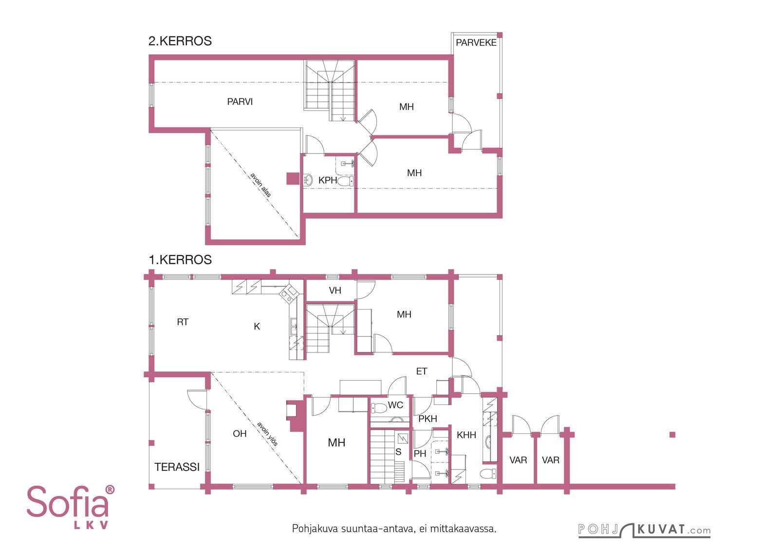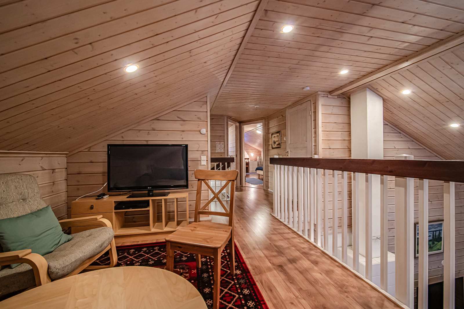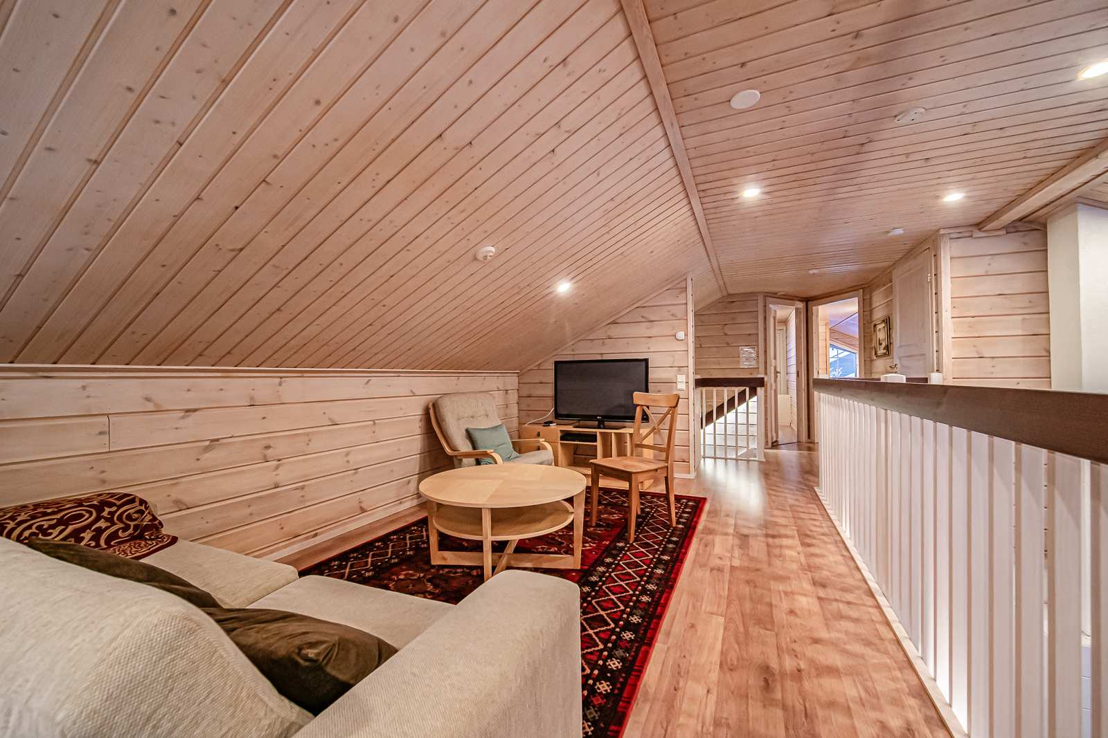 Ensimmäisessä kerroksessa tilava tupakeittiö, kaksi makuuhuonetta, toisessa vaatehuone, kodinhoitohuone wc:llä, erillinen wc sekä pukuhuone-kylpyhuone-sauna -osasto. Toisessa kerroksessa kaksi makuuhuonetta, molemmista käynti parvekkeelle, oleskelutila sekä kylpyhuone.