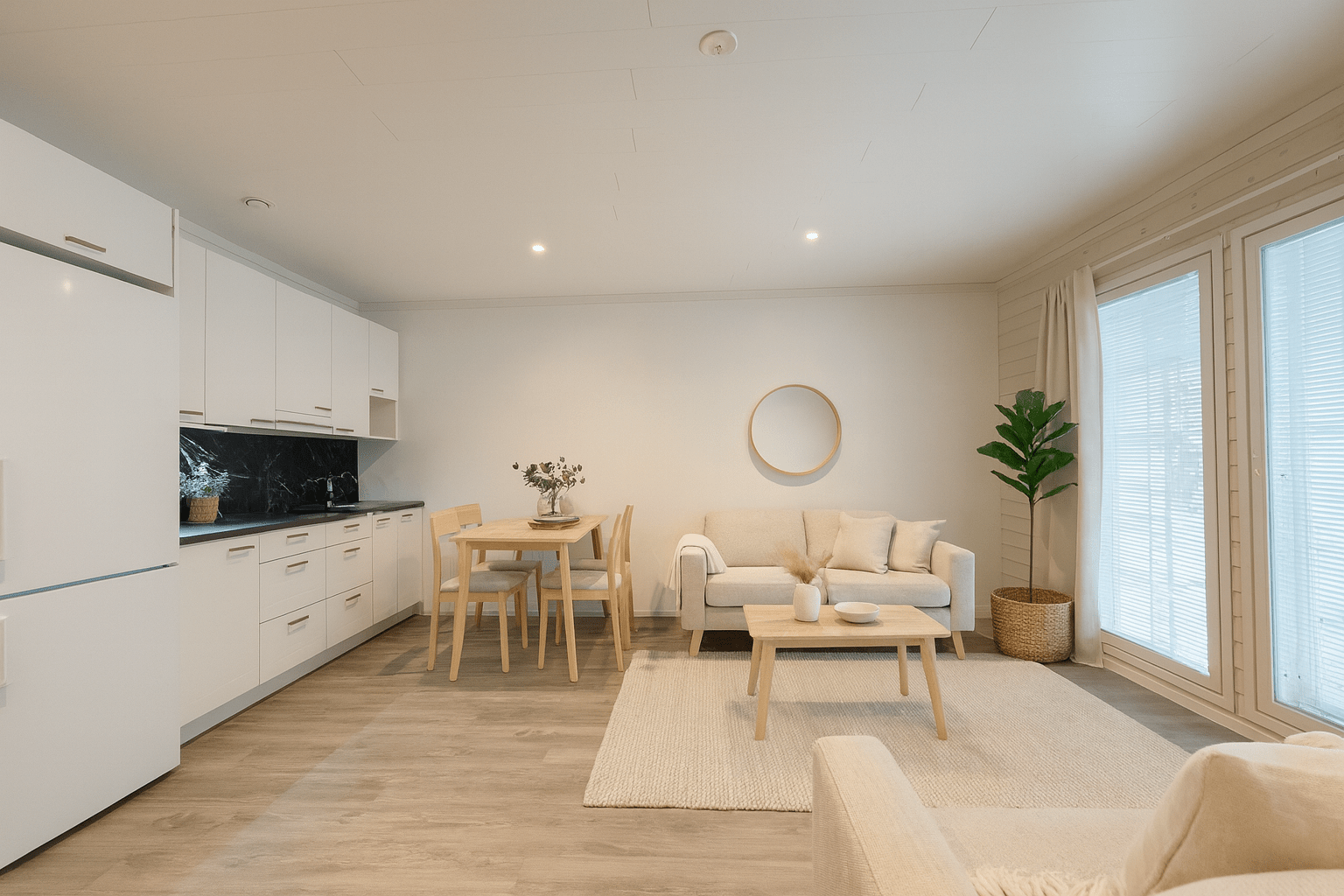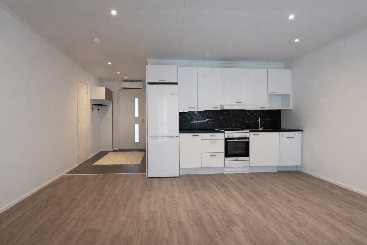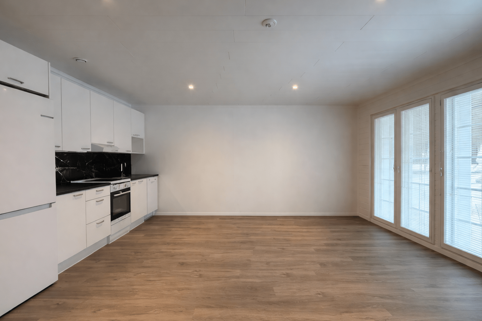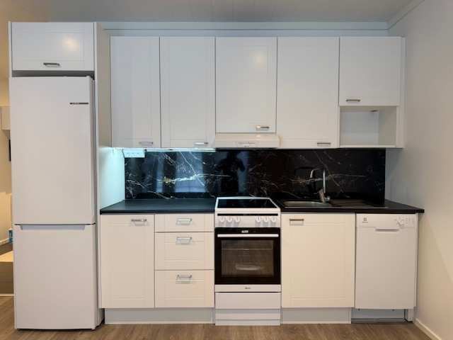 | Keittiön varustus | Jääkaappi ja pakastin: jääkaappi/pakastin Tasot: laminaatti Seinät: maalattu Lattia: vinyyli Muut varusteet: liesituuletin, astianpesukone, liesituuletin / suodatin Liesi/uuni: muu, induktio |