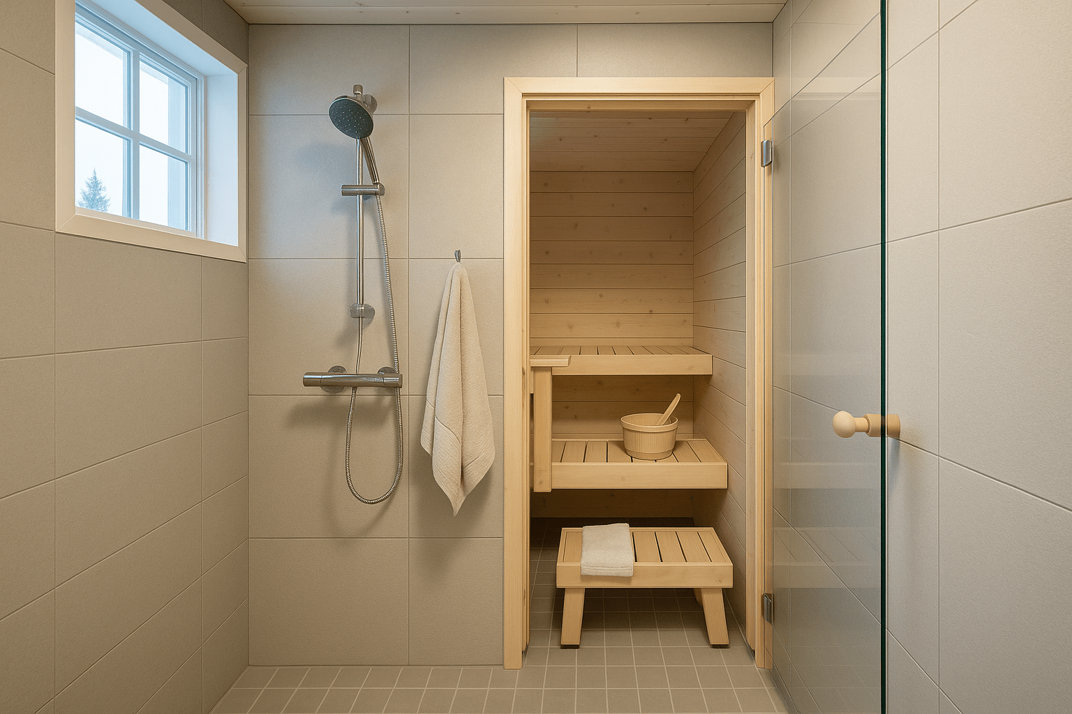 | Saunan pinnat | Seinät: puu Lattia: laatta |