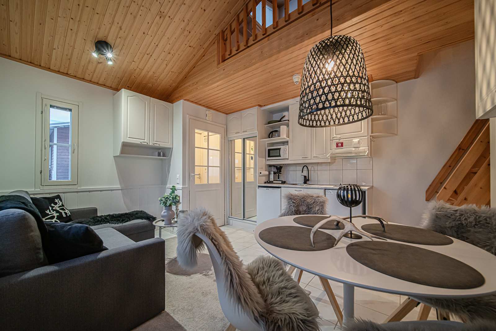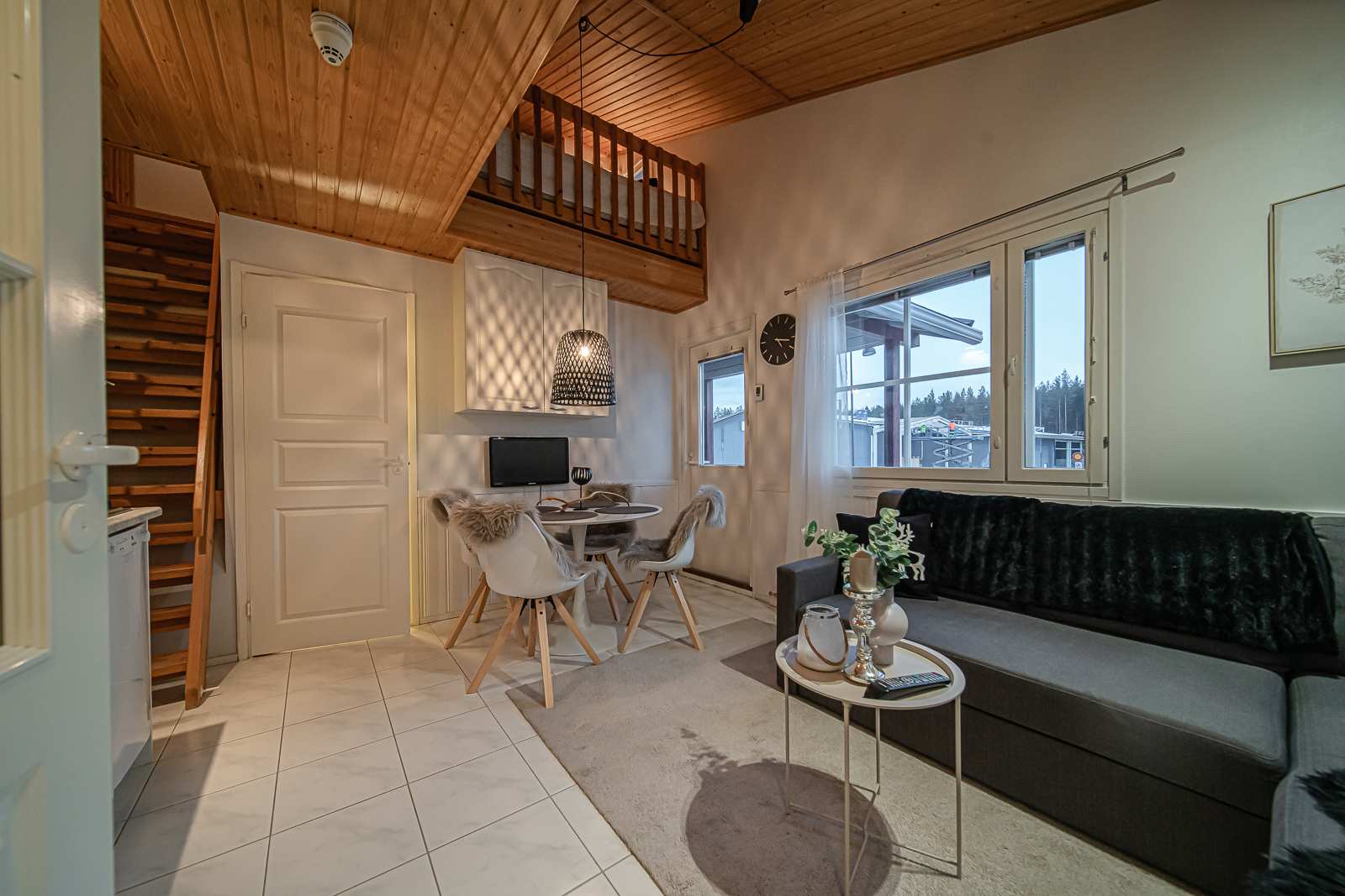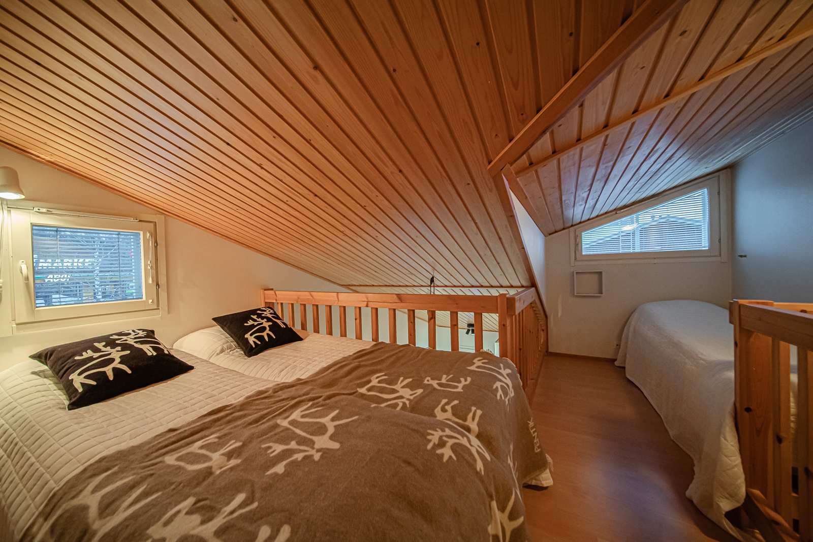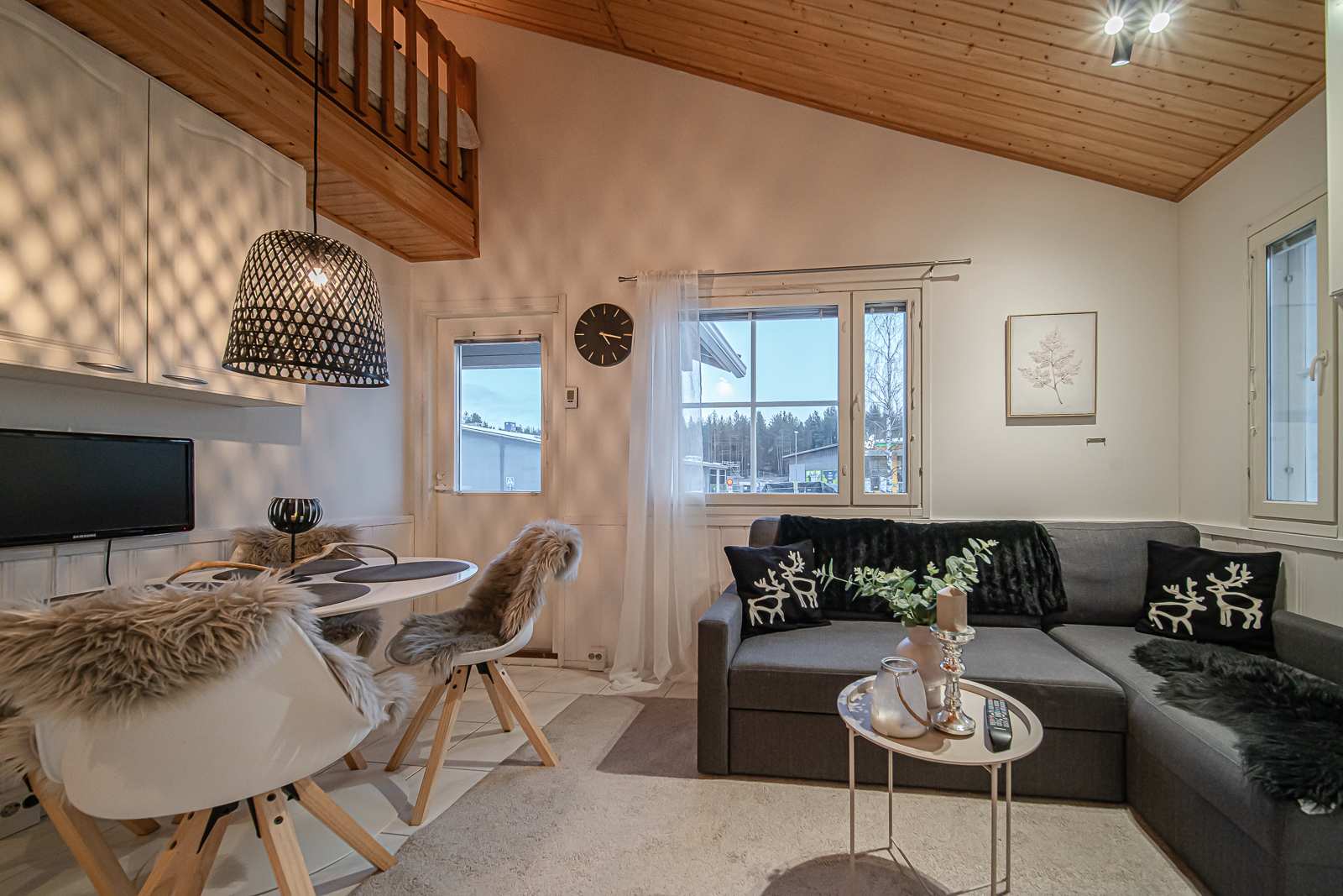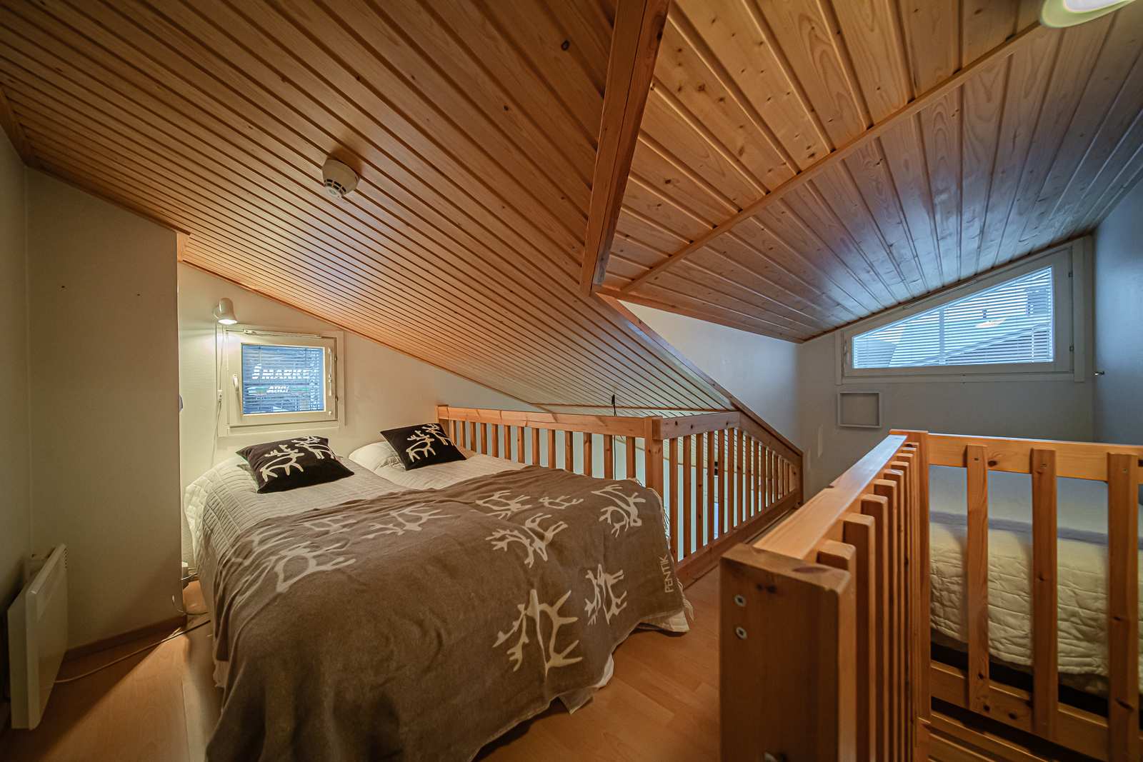 Asunnossa eteinen, tupakeittiö, parvi, kylpyhuone ja sauna. Pyykinpesukone ja vaatteiden kuivauskaappi. Sähköpistokkeellinen autohallipaikka. Wifi. Levin kylään matkaa vain noin 100m.
