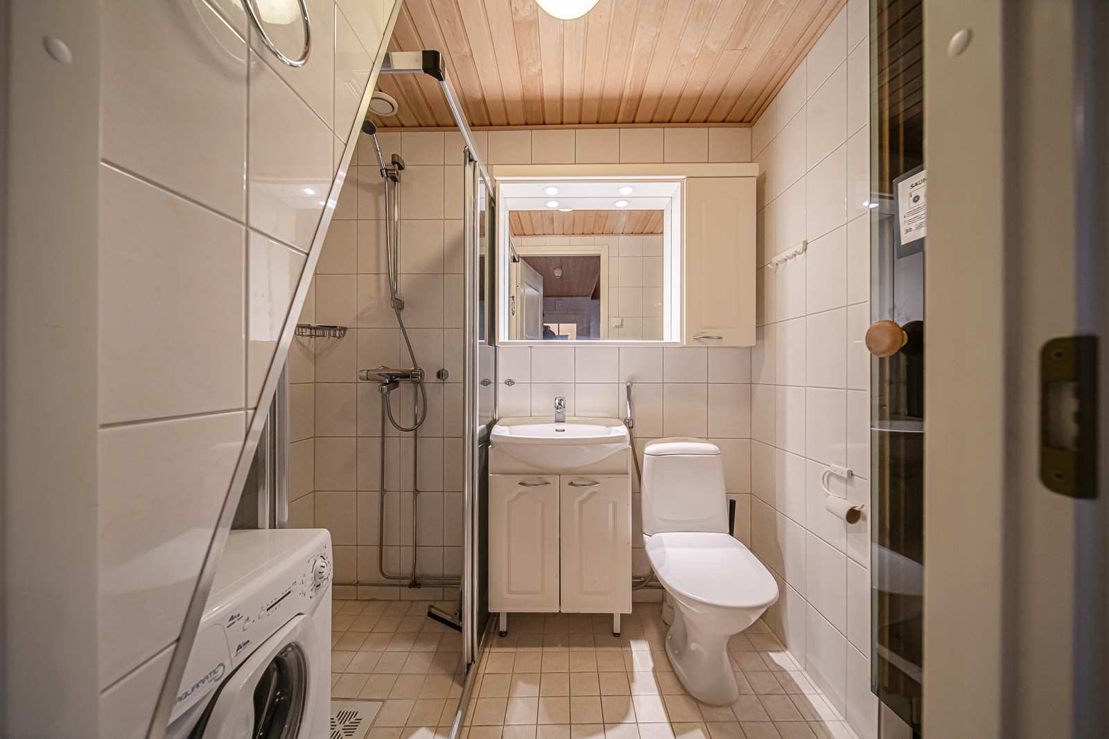 | Kylpyhuone | Varusteet: suihkuseinä, pesukone, pesukoneliitäntä, kuivauskaappi, lattialämmitys, wc-istuin, suihku, peilikaappi Seinät: kaakeli Lattia: laatta |