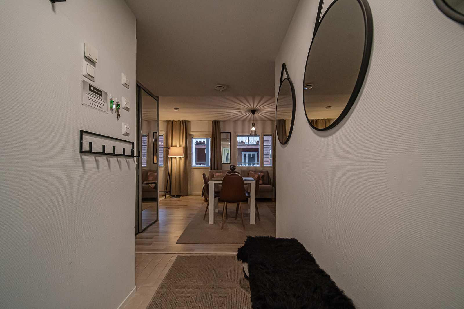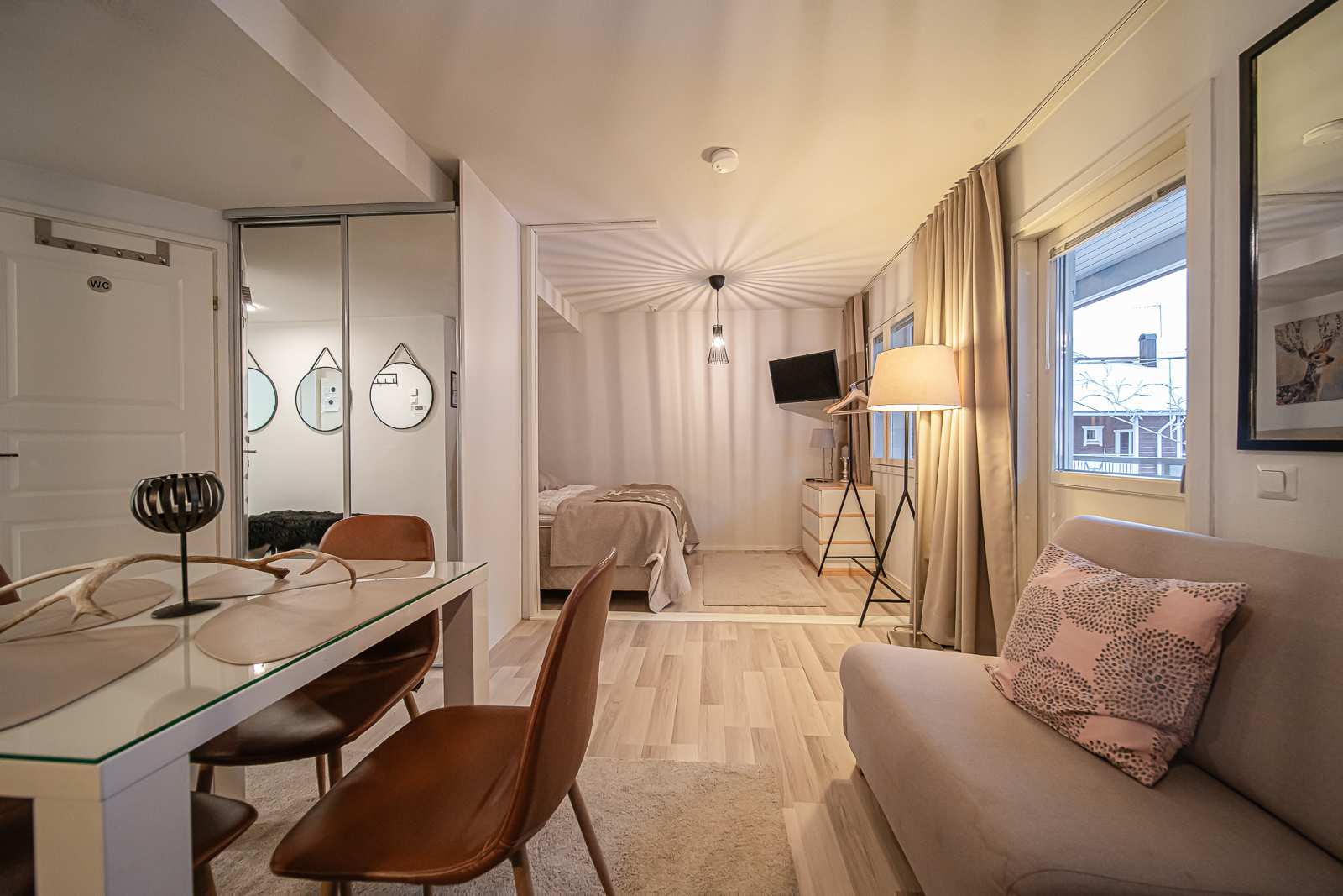 Huoneistossa makuualkovi, tupakeittiö, wc, pesuhuone ja sauna sekä huoneiston levyinen parveke Keskuskujalle. Makuualkovissa parisänky, tupakeittiössä kaksi vuodetuolia.