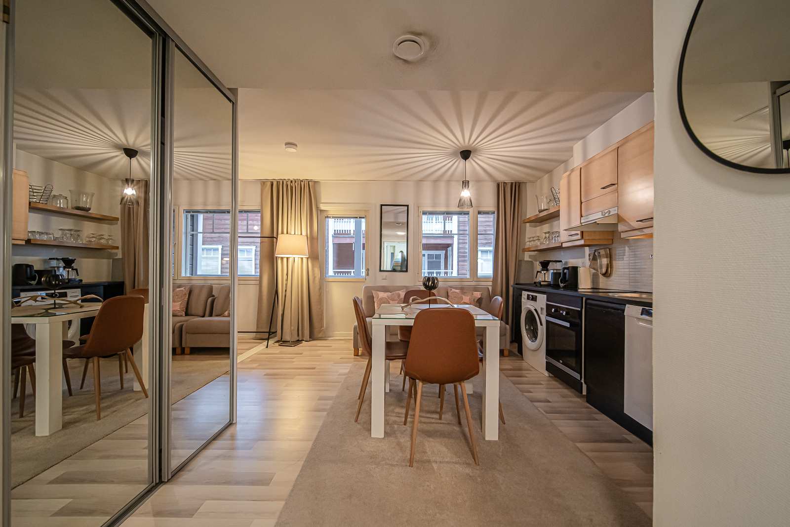 | Keittiön varustus | Jääkaappi ja pakastin: jääkaappi/pakastin Muut varusteet: mikroaaltouuni, astianpesukone, liesituuletin / hormi Tasot: laminaatti Seinät: maalattu, tapetti Lattia: laminaatti Liesi/uuni: induktio, erillisuuni |